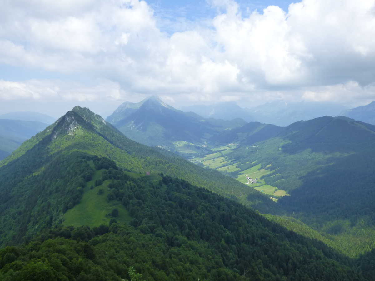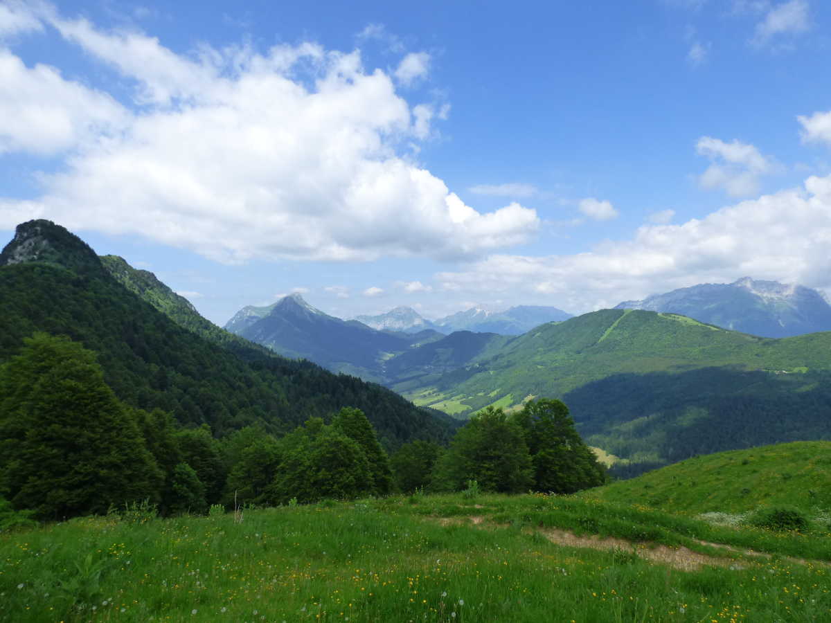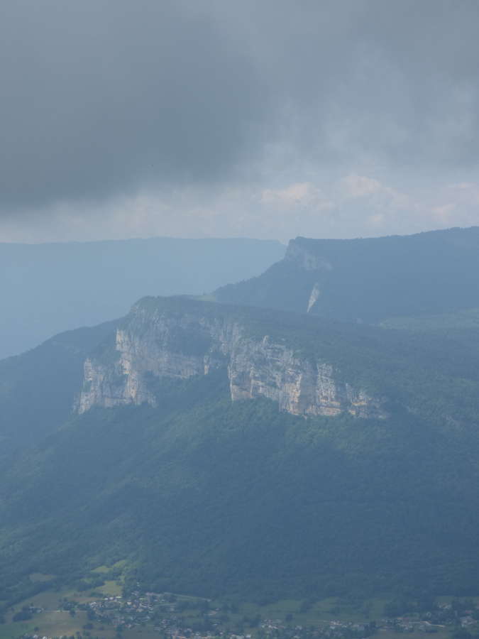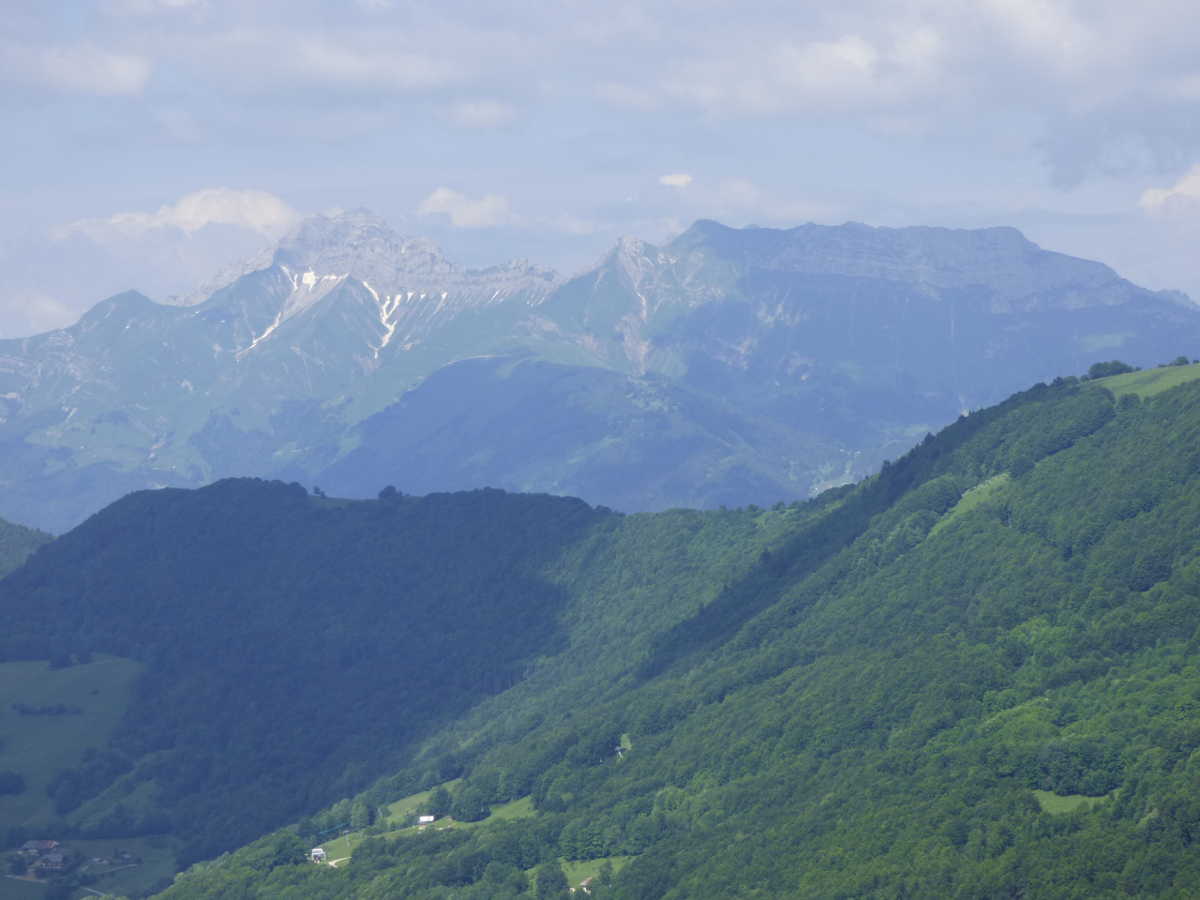 Côté Bauges, au premier plan, Margériaz, le Colombier, la station des Aillons puis la Dent d'Arclusaz à droite. Plus loin, le Mont Trélod, les Pointes de l'Arcalod et de Chaurionde, le Mont Pécloz...